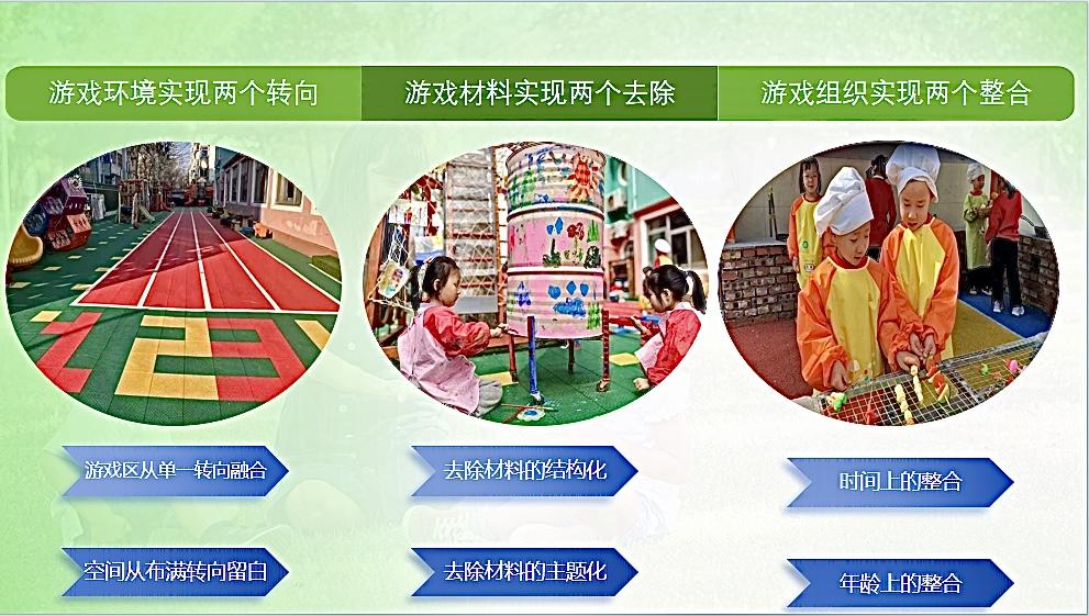游戏环境实现两个转向:游戏区从单一转向融合,实现区域间的联动;空间从布满转向留白,给幼儿自由支配游戏空间和场地的机会,满足自创性游戏的需要。