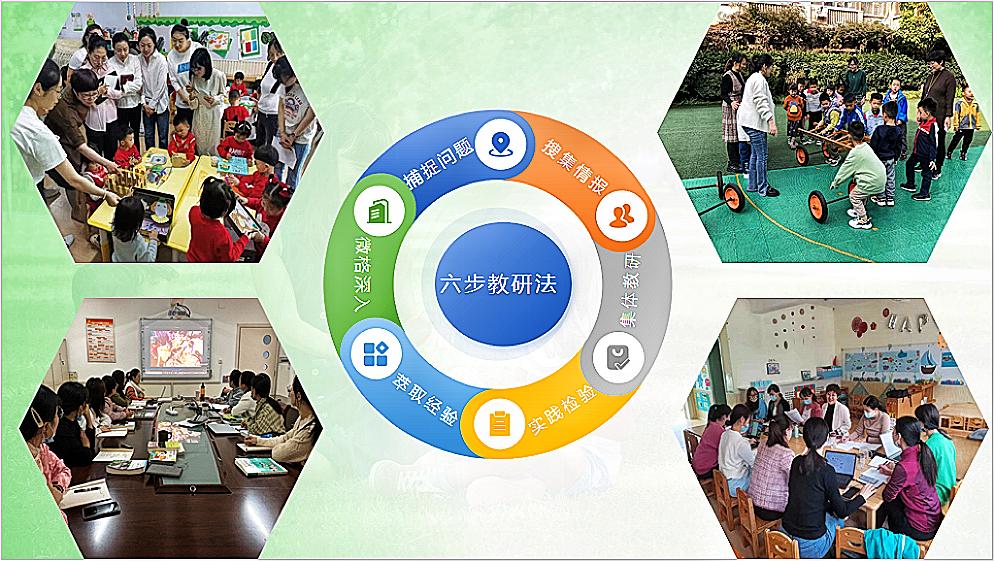 六步教研驱动游戏研究走向深入:每周开展游戏案例教研,每月进行游戏观摩教研,每次教研均经过捕捉问题、搜集情报、集体教研、实践检验、萃取经验、微格深入六个环节,实现研究的环状路径,教研由指导式转变为基于游戏现场的案例式、问题式。