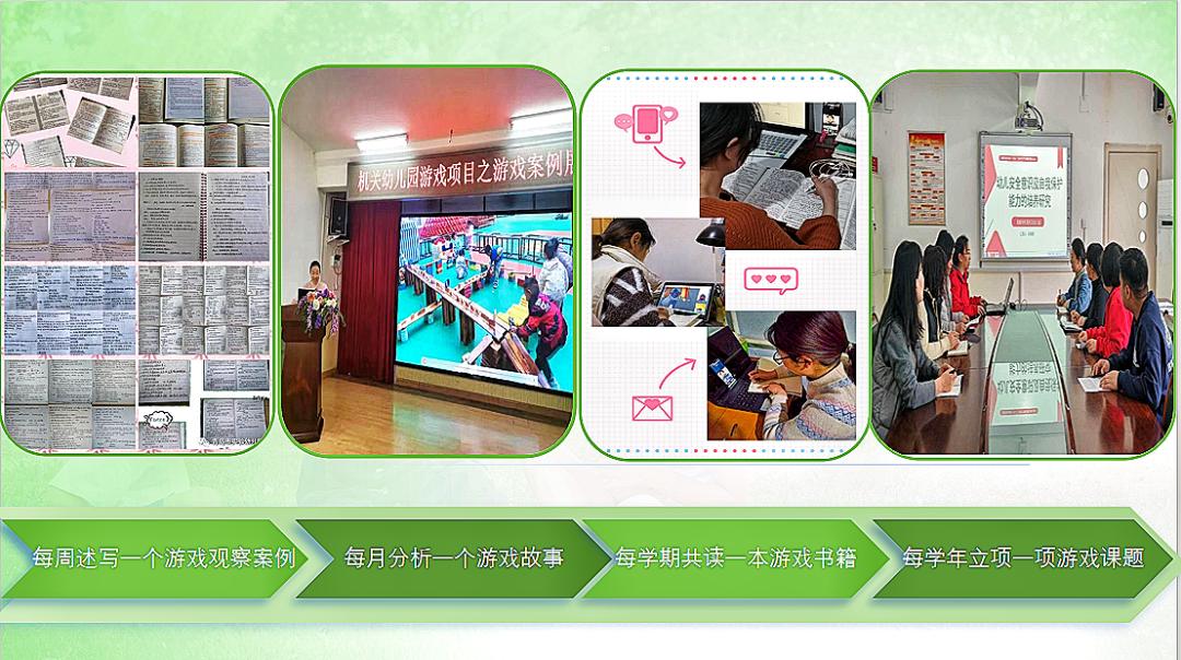 四项读写驱动游戏研究走向常态:教师每周述写一个游戏观察案例、每月分析一个游戏故事、每学期共读一本游戏书籍、每学年立项一项游戏课题,驱动教师建立科学的儿童观、教育观、课程观,指导幼儿在游戏中实现深度学习。