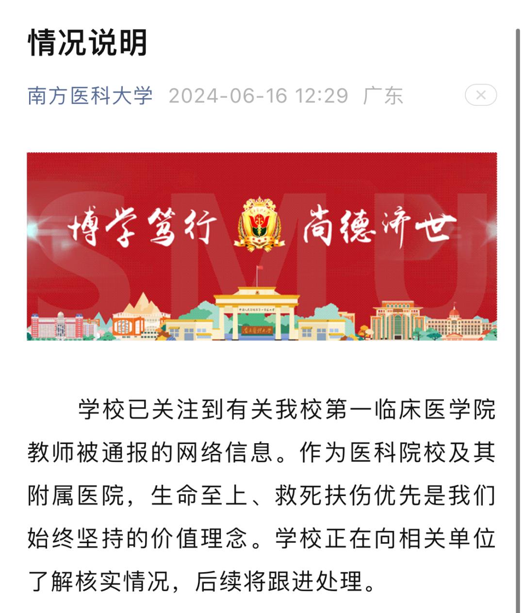 据传校方认定该教师迟到29分钟构成严重教学事故,虽因其系为抢救病人,并迅速完成后续教学,决定降级处理为教学差错,但仍处以扣奖金、通报批评及取消年度评优资格等惩罚。对此,6月16日,南方医科大学官方回应,强调学校坚持生命至上的价值理念,正在向相关单位了解核实情况,后续将跟进处理。