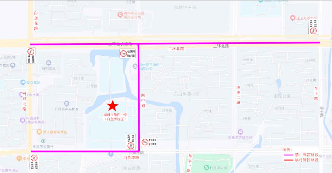 湖州市第四中学(白鱼潭校区)对白鱼潭路(外环北路至华丰一路)、四中路(白鱼潭路至二环北路)、二环北路含快速路(白莲花路至学士路)实行禁鸣喇叭,考试接送车辆进入周边停车场及停车位停靠。