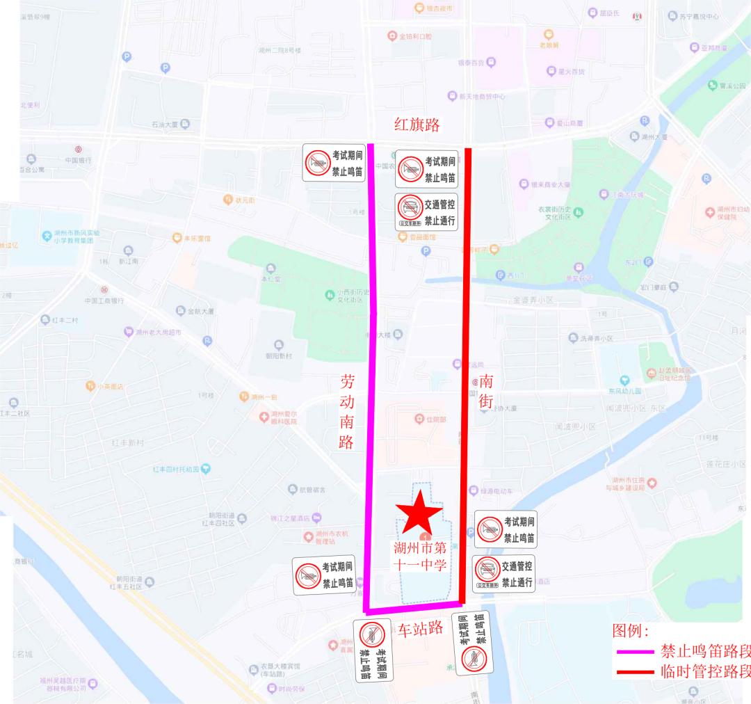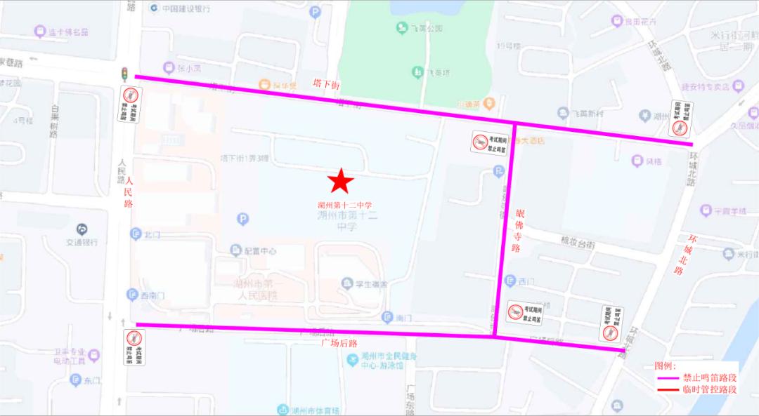 湖州第十二中学对塔下街(人民路至环城北路)、广场后路(人民路至环城北路)、眠佛寺街(塔下街至广场后路)路段实行禁止鸣笛,考试接送车辆进入周边停车场及停车位停靠。
