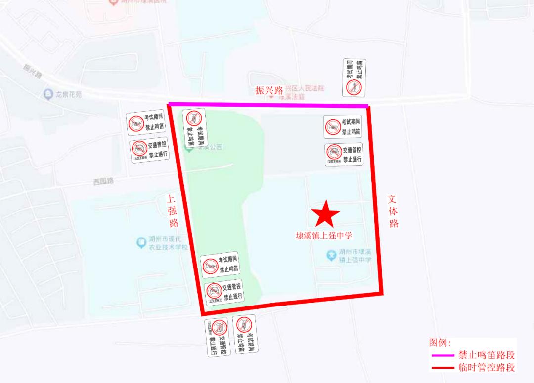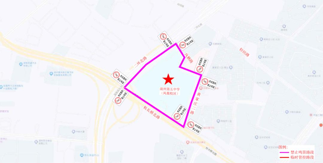 湖州第五中学(凤凰校区)对杭长桥北路、黄家庄二路、凤栖路、二环北路合围区域实行禁鸣喇叭。考试接送车辆有序停靠在黄家庄二路、二环北路、杭长桥北路临时上下客,接送车辆至周边停车场停放,考试期间不得停放在周边道路。考试期间对周边道路大货车实行临时交通管理措施,其他社会车辆视情实行临时交通管理。