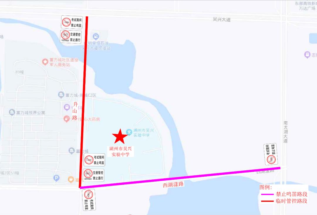 湖州市吴兴实验中学对升山路实行禁鸣喇叭,考试接送车辆有序停靠在升山路临时上下客。考试期间对升山路采取临时交通管理措施。考试结束后在不影响社会车辆通行情况下,接考生车辆可沿升山路单边停放。