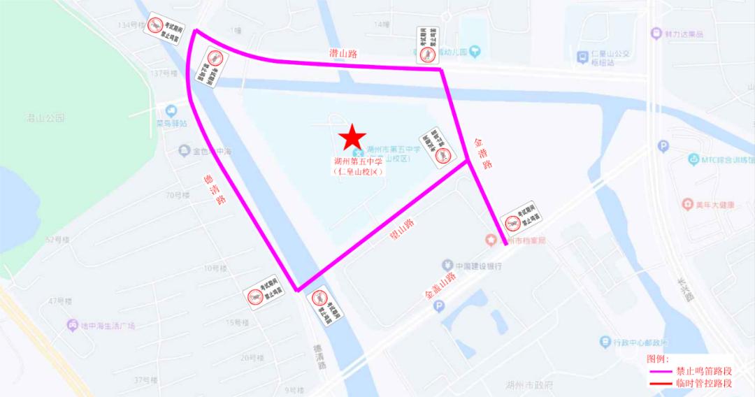 湖州第五中学(仁皇山校区)对望山路、潜山路、金潜路、德清路(望山路口至潜山路口)实行禁鸣喇叭,接送考生车辆可在金潜路和潜山路有序停放。