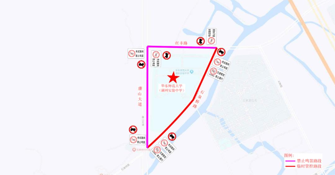 华师大湖州实验中学对康山大道(石泉桥路至红丰路)、红丰路(康山大道至石泉桥路)、石泉桥路(红丰路至康山大道)实行禁鸣喇叭。考试接送车辆有序停靠在石泉桥路、红丰路、富家浜路临时上下客。考试期间对石泉桥路(红丰路至康山大道)实行临时交通管理措施。考试期间对周边道路大货车实行临时交通管理措施,其他社会车辆视情实行临时交通管理。