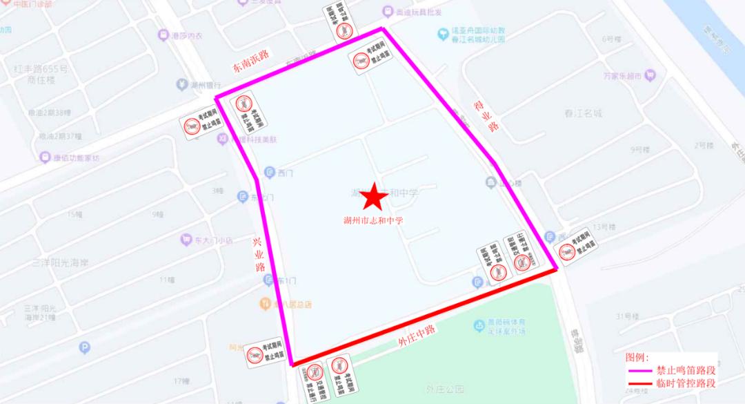 志和中学对外庄中路、得业路(外庄中路至东南浜路)、东南浜路(兴业路至得业路)、兴业路(东南浜路至外庄中路)实行禁鸣喇叭。考试接送车辆有序停靠在外庄中路、兴业路、得业路临时上下客。考试期间对外庄中路实行临时交通管制措施。