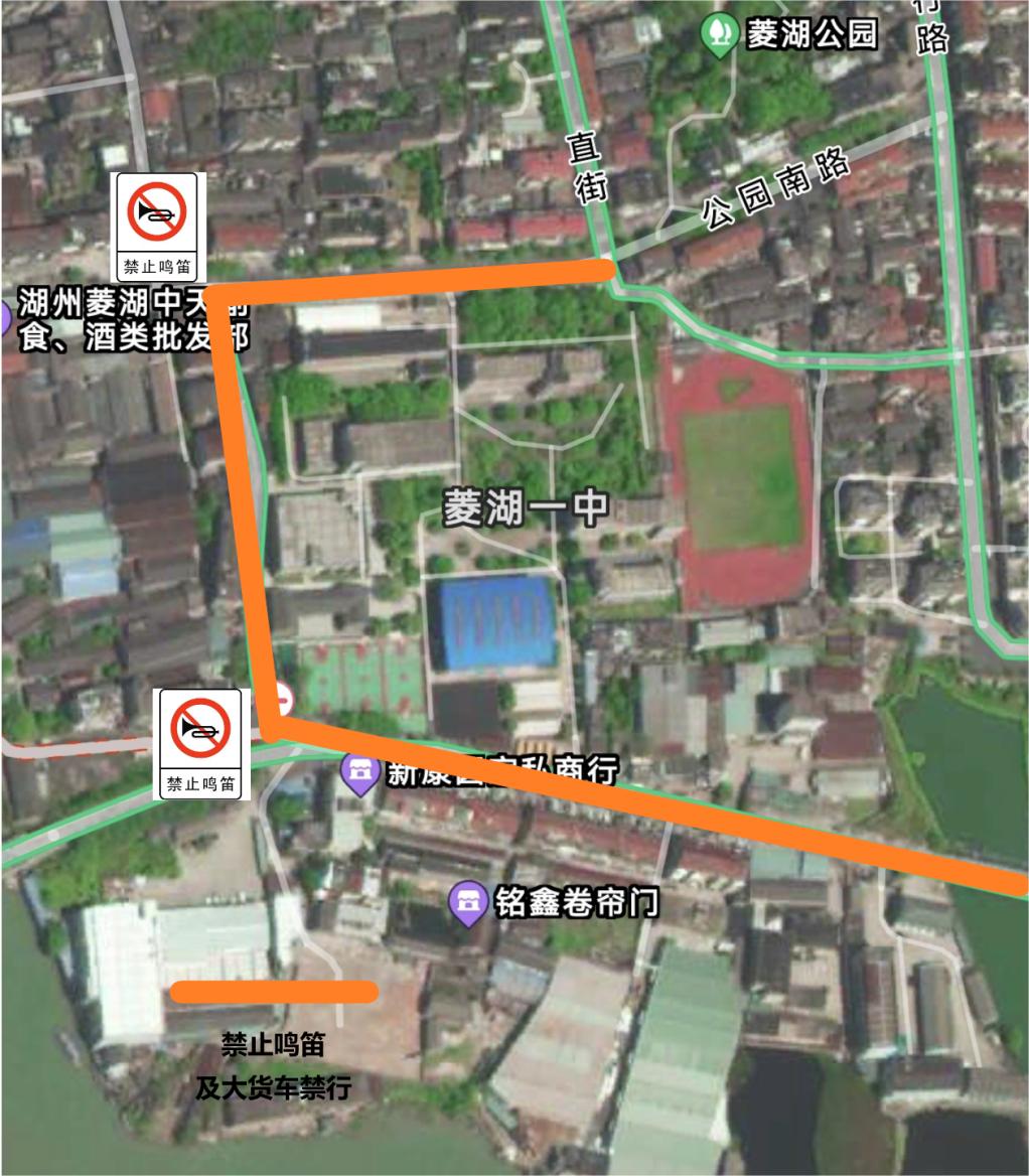 菱湖一中公园南路(直街路口至人民路路口),人民路(公园南路至振菱路路口),振菱路(振兴路路口至人民路路口),以上路段禁止大型货车通行,并同步采取禁鸣措施。