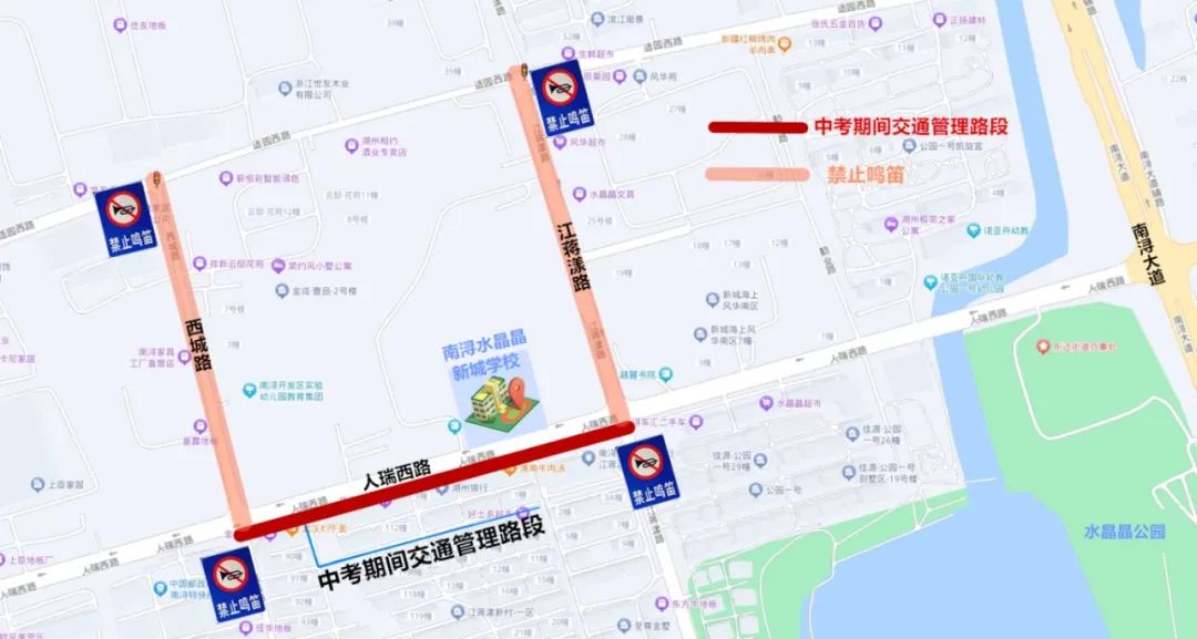 水晶晶新城学校对人瑞路的西城路至江蒋漾路路段采取临时交通管理措施,禁止鸣笛,过往车辆绕道通行。