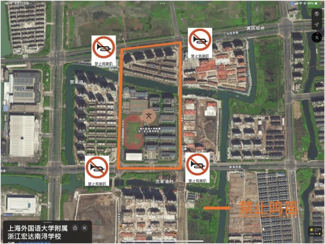 上海外国语大学附属浙江宏达南浔学校对联谊路、沈塘路、沈家港路实行禁鸣喇叭,考试接送车辆在路边临时停车位有序停靠。