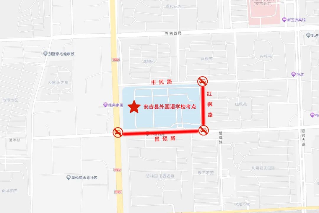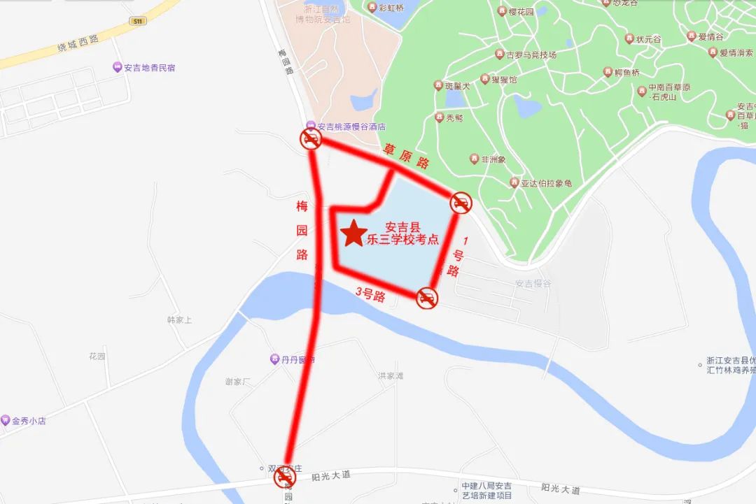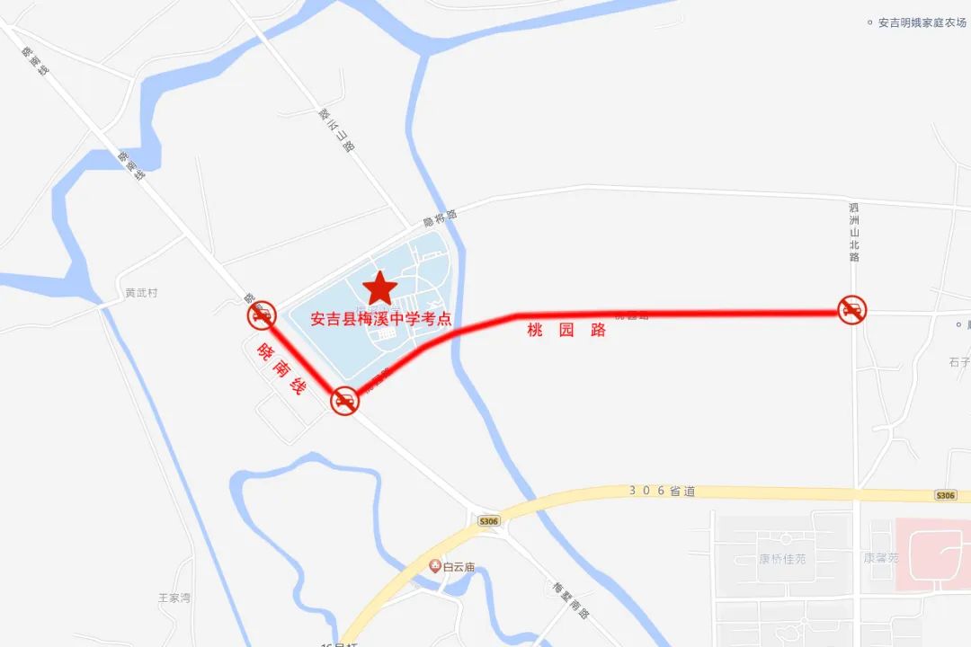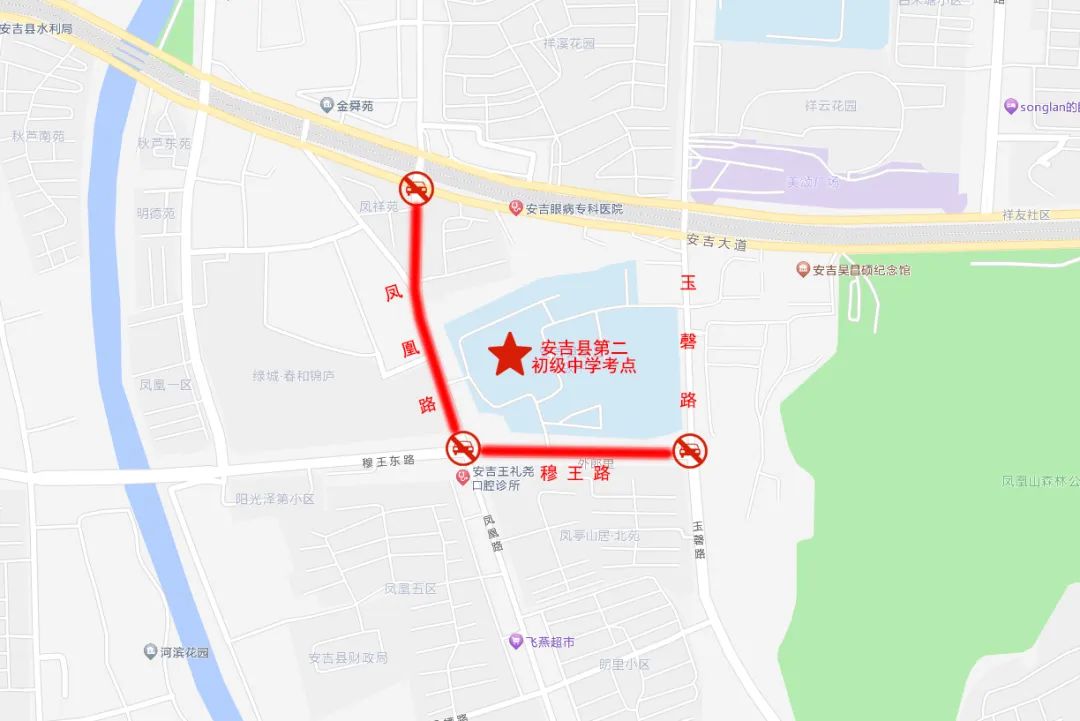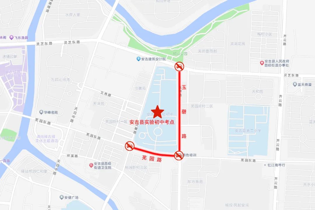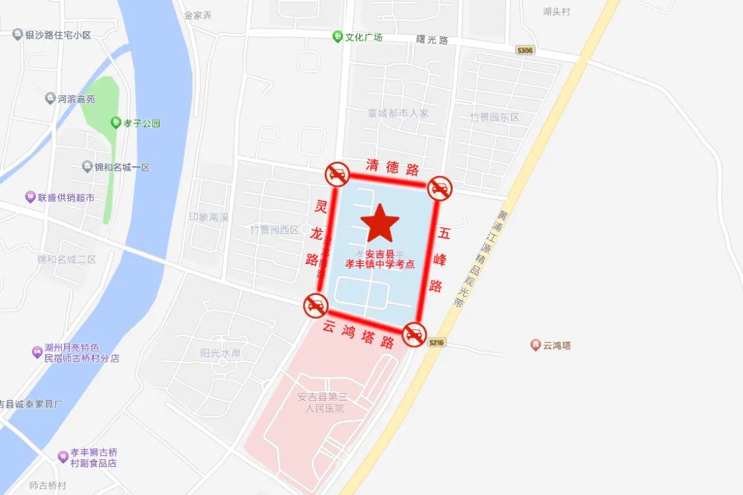 考试期间,安吉县实验初中、安吉县外国语学校、安吉县第二初级中学、安吉县乐三学校、安吉县孝丰镇中学、安吉县天子湖中学、安吉县梅溪中学考场周边道路禁止鸣笛。届时,请广大机动车辆绕行。