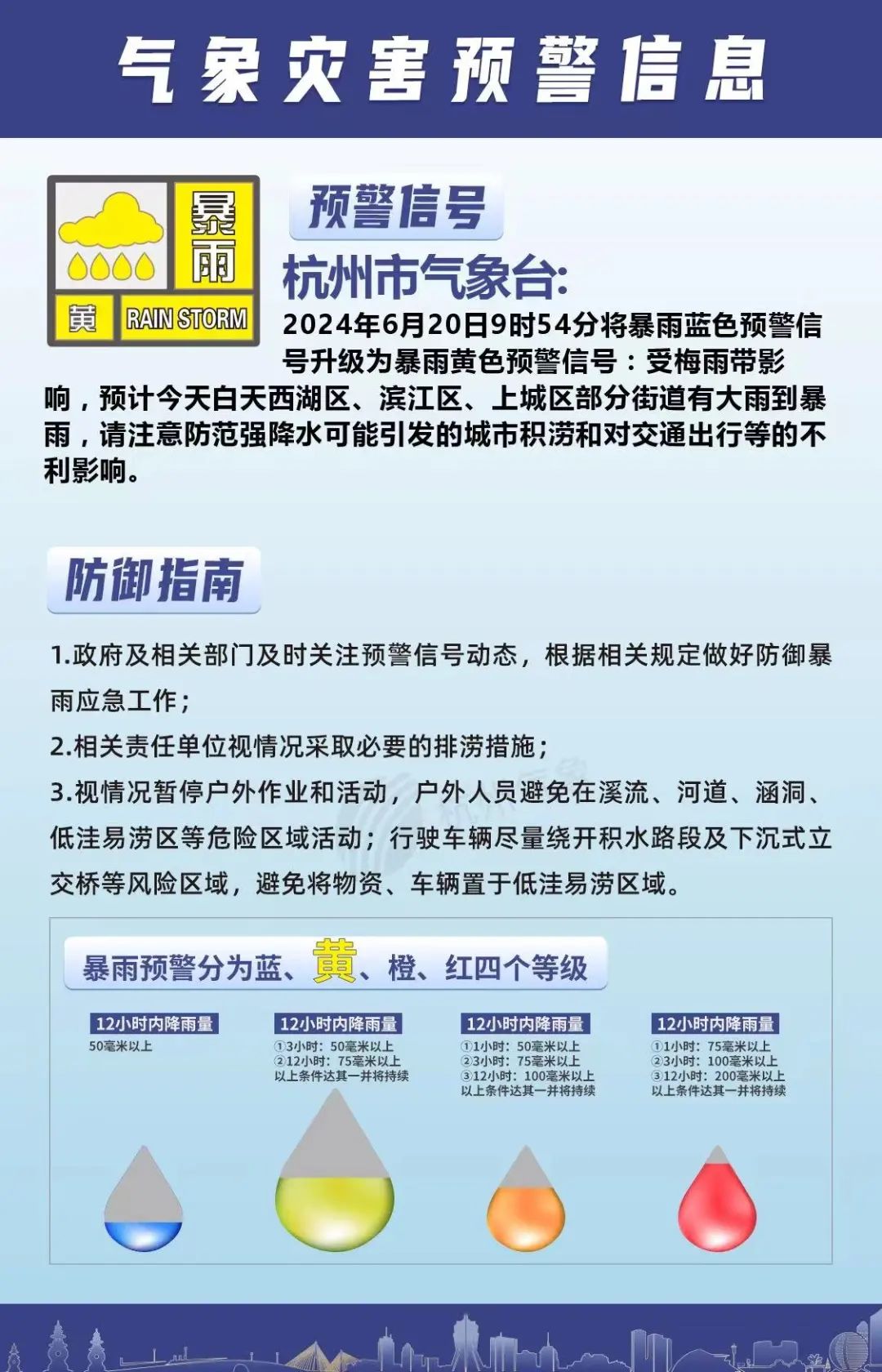 刚刚,杭州市气象局将暴雨蓝色预警信号升级为暴雨黄色预警信号!今天上午,杭州多地也纷纷将暴雨预警升级,一起来看↓↓