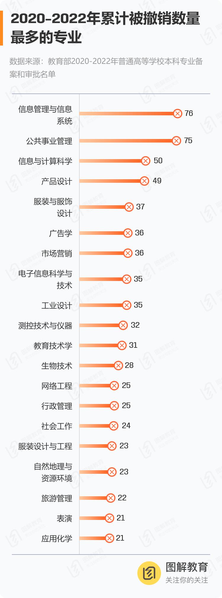 可惜的是,图解教育工作室在教育部官网未发现本次被撤销的1670个专业详细名单。不过,近几年的同样具有足够的借鉴意义。分析2020-2022年3年被撤销的2247个专业名单可知,信息管理与信息系统、公共事业管理是被撤销数量最多的2个专业,其数量几乎断档式领先,排名第3的专业则是信息与计算科学。