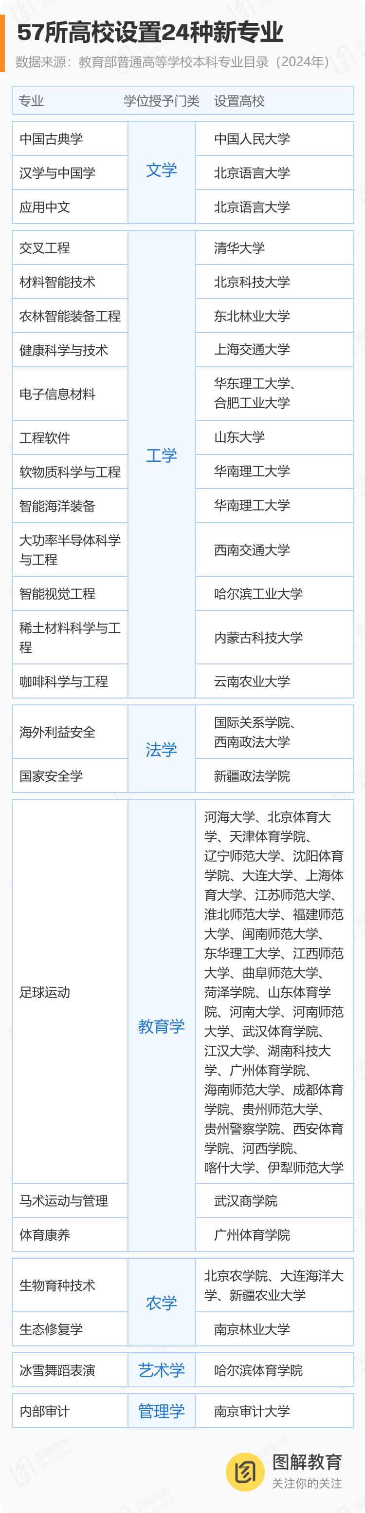 此次,教育部并发布了2024年普通高等学校本科专业目录,其中,电子信息材料、软物质科学与工程、大功率半导体科学与工程、生物育种技术等24种新专业,正式纳入本科专业目录。数据显示,全国共有57所高校设置了这些新专业,分别为: