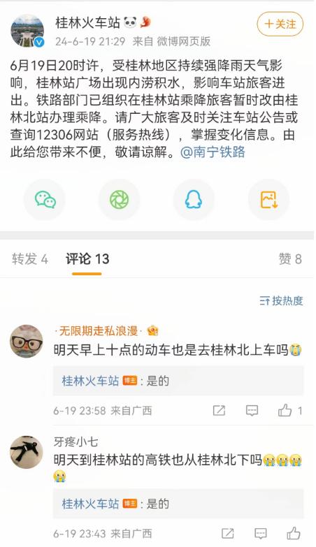 6月19日晚间,桂林站内出现大面积积水。19日21时,桂林火车站官方微博也发布消息,证实了该网友说法。消息称,6月19日20时许,受桂林地区持续强降雨天气影响,桂林站广场出现内涝积水,影响车站旅客进出。铁路部门已组织在桂林站乘降旅客暂时改由桂林北站办理乘降。