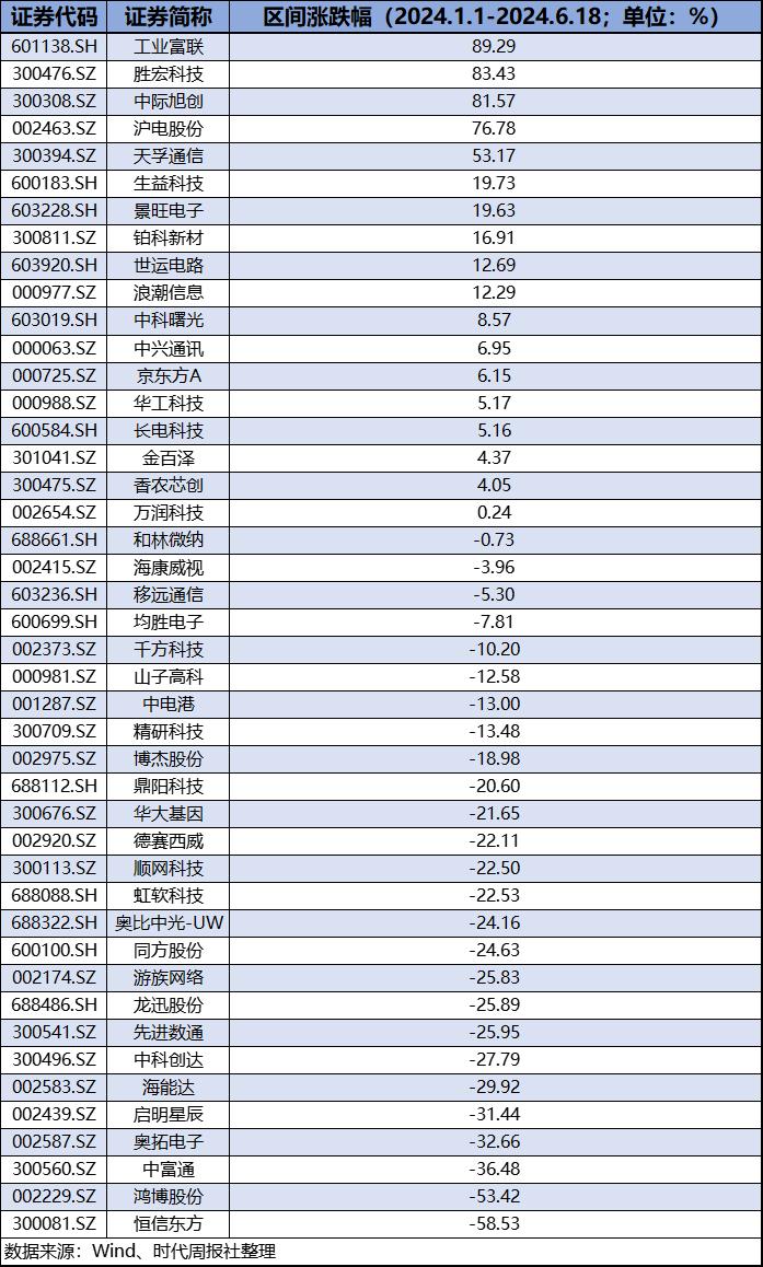 此外,今年截至6月18日上涨超五成的还有沪电股份(002463.SZ)和天孚通信(300394.SZ),年内分别累计上涨76.78%、53.17%。