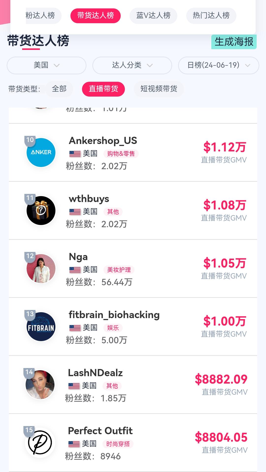 图/15位左右即单场直播无法破万的达人榜毕竟,对于张旭、张颖这样的外贸商家而言,本土直播,需要在美区当地有成熟的的团队操盘,而这样的时间成本和预算,并不是普通外贸商家能够承担的。“在美国本土搞直播,只有国内的头部MCN,才有这个能力和资金,具体的费用那就是千万级了,不然熬不过这个周期。”张旭表示,作为小玩家如外贸商,目前最保本的合作方式,仍然是与成熟的达人直播间合作。
