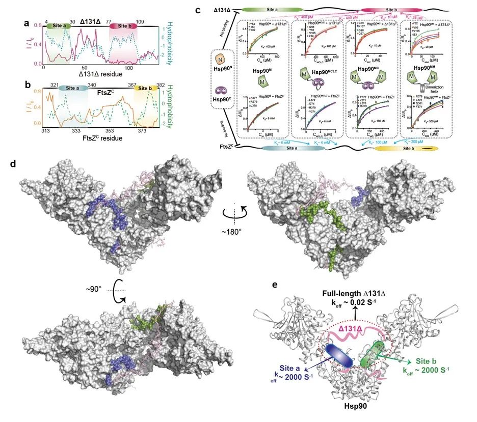 图1. Hsp90与固有无序蛋白的复合体结构及其动态相互作用机制本研究首先对Hsp90与两种固有无序蛋白底物的动态相互作用进行了详细研究,描绘了相互作用界面并对其进行了定量表征。研究发现,Hsp90通过其V字形展开的双臂同时捕捉底物蛋白的两个疏水片段,形成了独特的“二分式”结合模式,即每个Hsp90单体分子捕获底物的一个疏水结合区域。这种结合方式表现出显著的协同效应:“1+1≫2”,显著延长了底物在Hsp90表面的停留时间。进一步研究表明,这种结合模式在不同物种的Hsp90中高度保守。同时,核磁共振的动态分析显示,底物蛋白在Hsp90结合界面上仍保持高度动态特性:每次被Hsp90捕捉后,底物并没有被牢固束缚,而是在Hsp90表面进行多达10万次的构象调整,直至最终以活化构象被释放(图1)。在这一过程中,底物蛋白始终保持无结构的松散状态,这解释了为何Hsp90的多种序列不同、结构迥异的底物都表现出显著的热力学不稳定性。