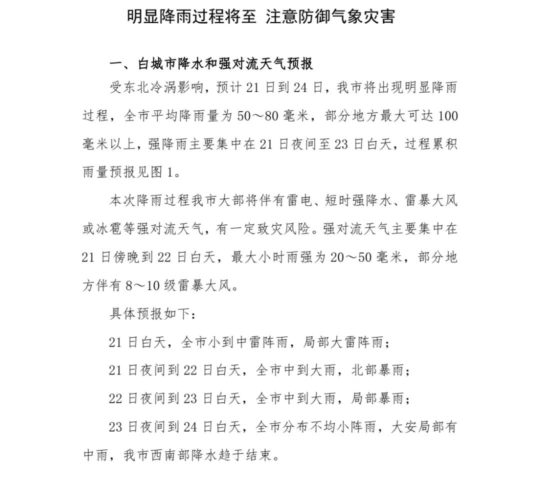 受东北冷涡影响,预计21日到24日,白城市将出现明显降雨过程,全市平均降雨量为50~80毫米,部分地方最大可达100毫米以上,强降雨主要集中在21日夜问至23日白天。