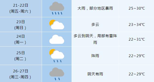 暴雨预报和全市天气预报:今天白天到明天早晨我市部分地区将出现强降水,请注意防范强降水可能引发的城市内涝和地质灾害等次生灾害。今天白天到明天早晨:阴天有大雨到暴雨,局部大暴雨。偏南风3级,雷雨时阵风7级。今天白天最高气温:31~32℃。明天早晨最低气温:25~26℃。预计:22号,阴天有中到大雨,局部暴雨。