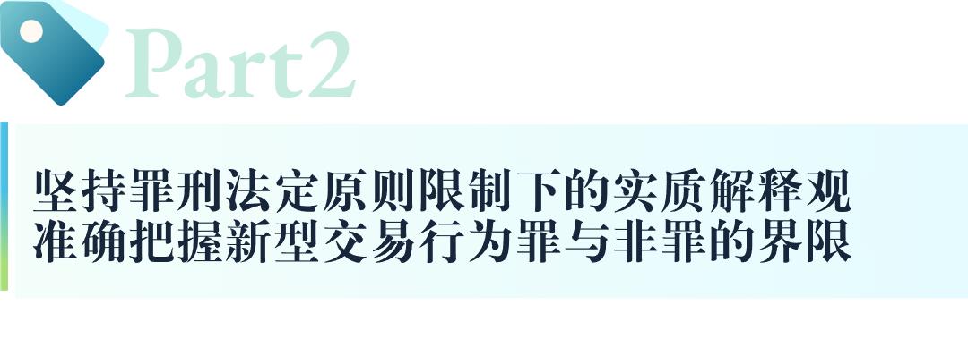 不可否认的是,金融市场的多变性、创新性与法律规范的稳定性、可预期性与滞后性之间存在着不可避免的现实矛盾,而这一矛盾也为新型不法证券、期货行为的滋生提供了一定空间。从实践看,新型不法行为的出现,不仅导致行政监管难度加大,刑事司法处置也存在诸多空白地带。人民法院等司法办案机关应当在遵循罪刑法定、刑法谦抑等基本原则或理念的基础上,从以下三个方面把握好新型不法行为性质的认定以及刑事干预的边界:➣ 第一,在罪刑法定原则的限制下,坚持实质解释论立场,根据法益侵害以及社会危害程度对不法行为作实质、合理评判。
