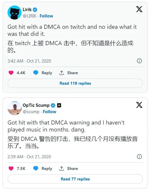 根据《千禧年数字版权法》(DMCA),版权方可以随时通知平台侵权情况。收到通知后,平台必须及时移除或禁止访问侵权内容。近年来,Twitch的DJ们收到了大量“删除通知”,若累计三次版权警示,将被视为重复侵权者,面临永久封禁的风险。对于DJ们来说,因曲库问题无法在直播中播放最新的热门歌曲本就掣肘,而这种频发的“删除通知”无疑是雪上加霜。甚至,有DJ在社交媒体吐槽:“都得把自己的账号删了才安全。“