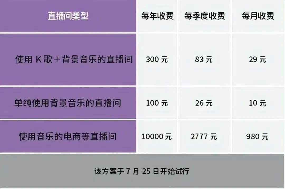 早在2022年7月25日,音集协就正式发布《互联网直播中使用录音制品付酬标准(草案)》(以下简称《草案》),其中明确将直播间被划分为三种类型:使用K歌和背景音乐的直播间、仅使用背景音乐的直播间,以及使用音乐的电商直播间。每年的收费标准分别为300元、100元和10000元;每季度的收费标准为83元、26元和2777元;每月的收费标准为29元、10元和980元。