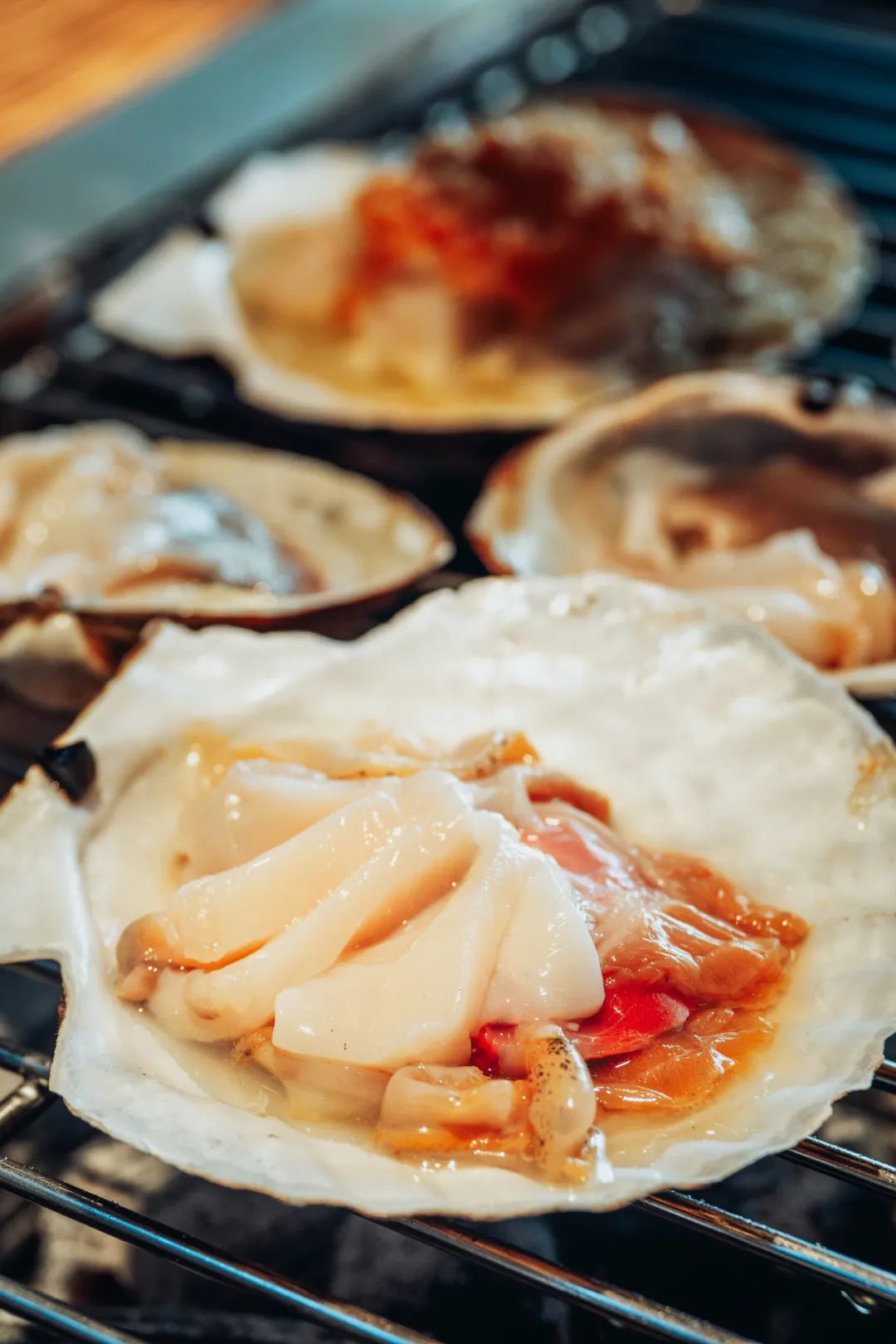 炭火烤扇贝,只清烤就已十分鲜美。摄影/吴学文