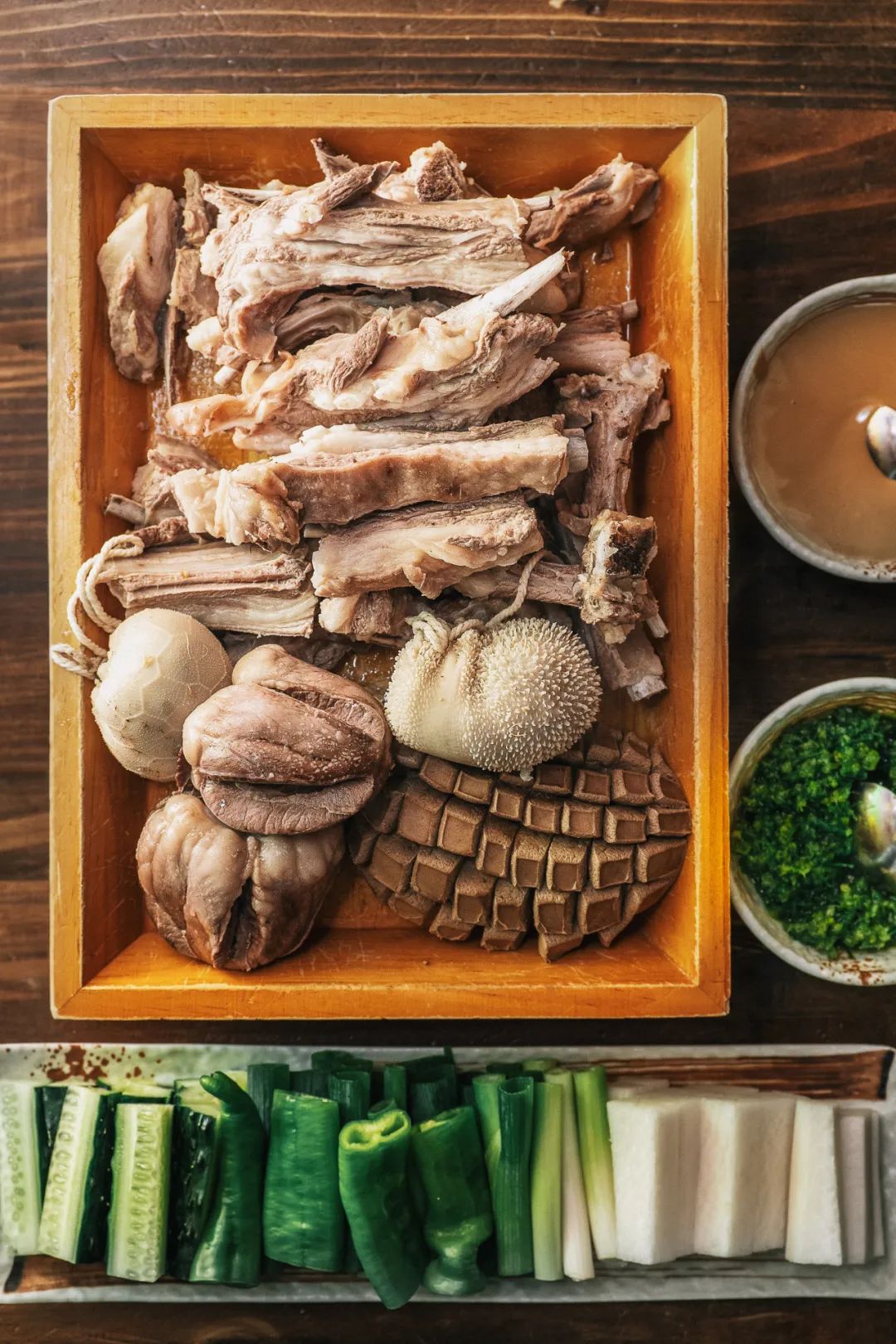 正餐里,手把肉是必不可少的选择,然而在吉林,可以水煮的不止羊排,还有牛心、羊肝等等少见的部位;但最有创造力的还要数肚包肉,肚的脆弹和肉的香嫩完美组合,再加上一点韭花酱,堪称绝配。