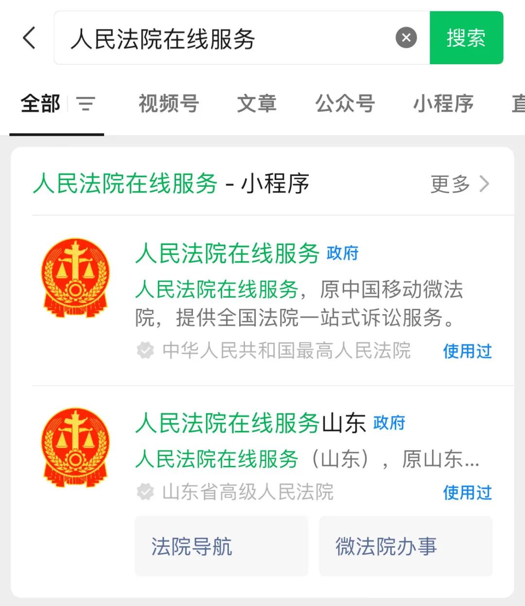 在微信小程序中搜索“人民法院在线服务”或“人民法院在线服务山东”(具体可按您想要立案法院所在的省、自治区、直辖市名称进行搜索),即可进入人民法院在线服务平台。