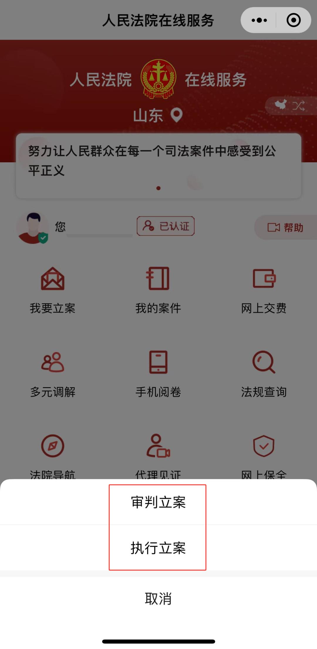 首页点击“我要立案”,界面会出现“审判立案”和“执行立案”两个选项以及“取消”选项。点击“审判立案”可进行民事、行政立案,点击“执行立案”可进行强制执行立案,点击“取消”则返回首页。
