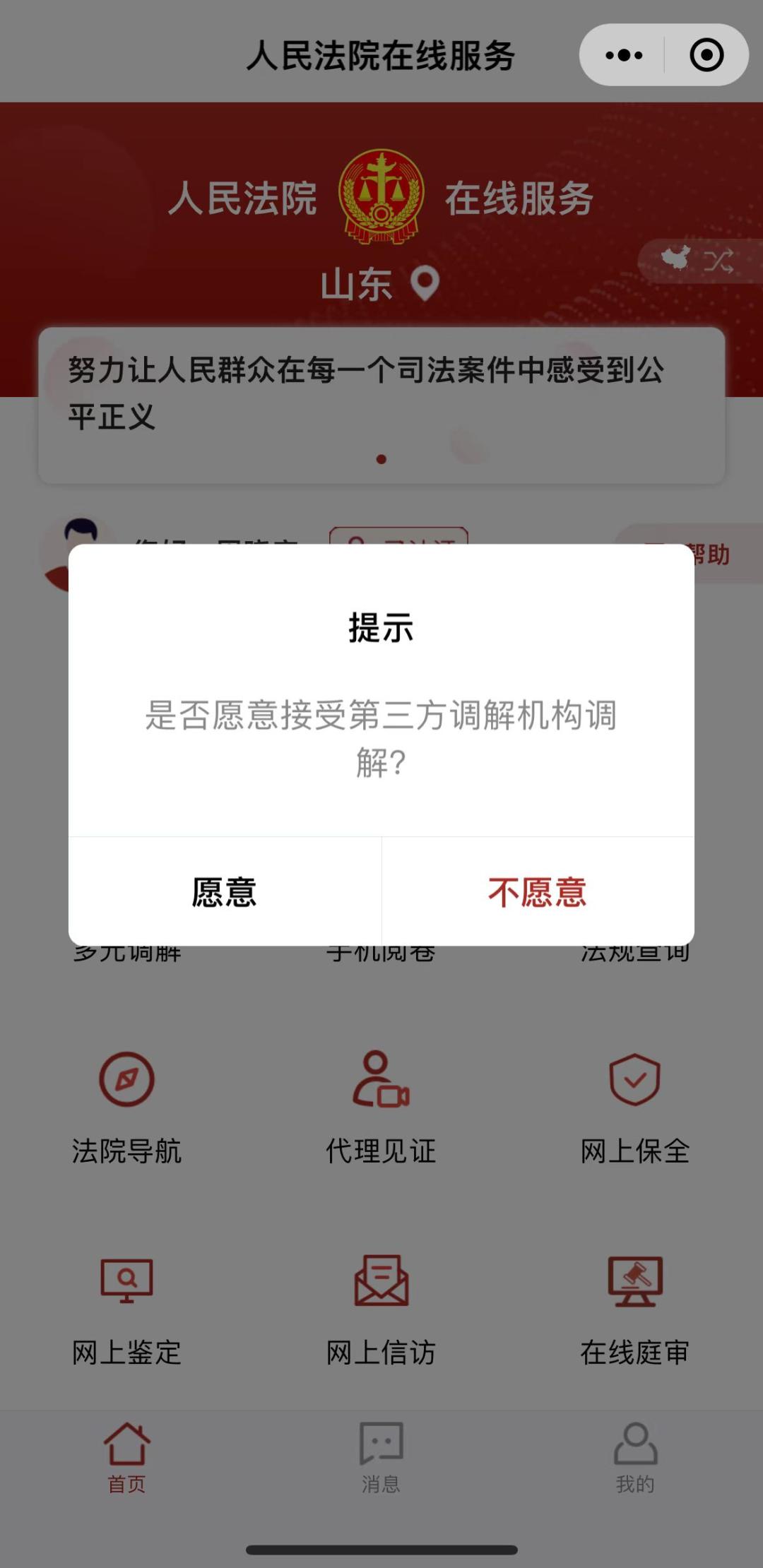 点击“审判立案”界面会出现是否愿意接受调解。如果您愿意接受第三方调解,请您选择“愿意”,进入“多元调解”小程序申请调解;如果您想要直接立案,请您选择“不愿意”,进入立案页面,点击“审判立案”进行诉讼立案。