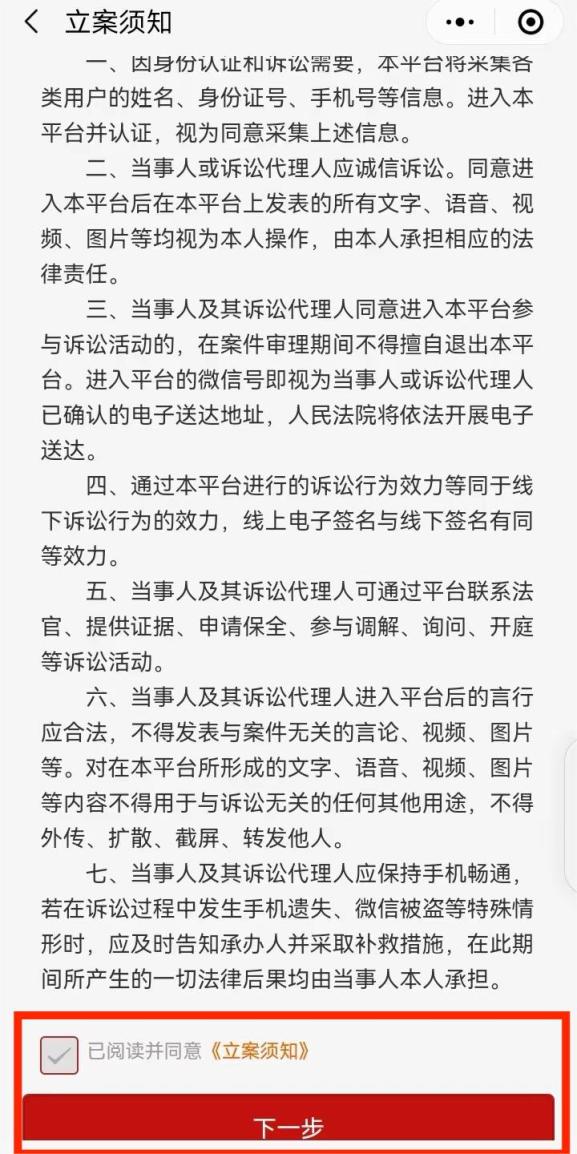 第三步:认真阅读须知阅读立案须知后,请点击“下一步”进入立案材料提交界面。
