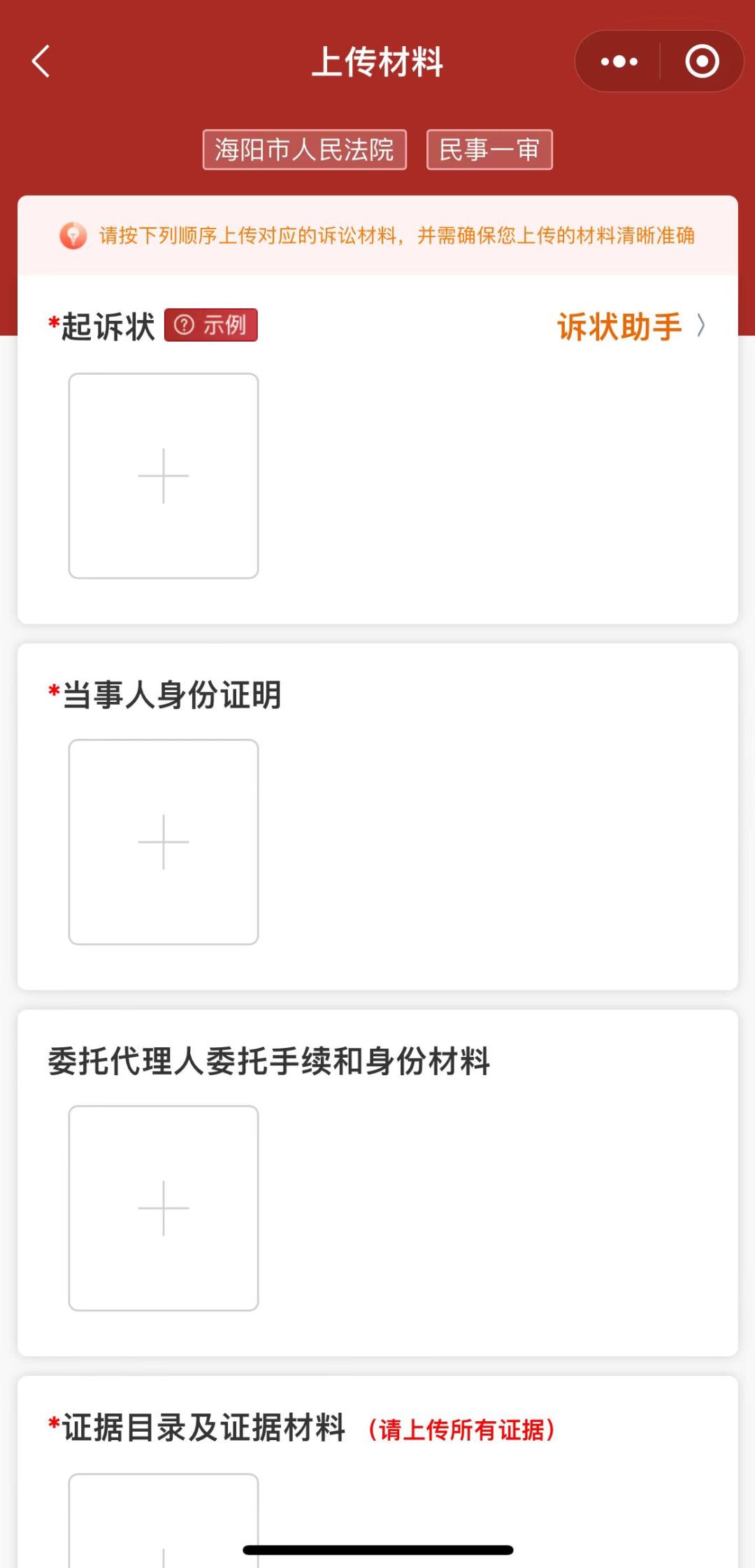 第四步:提交立案材料网上立案提交的材料可以是图片或者PDF格式。在上传材料界面,点击“+”号输入框(若材料较少,可通过拍照上传,需拍摄平整清晰,背景不杂乱。如材料较多,建议先扫描成PDF文件后上传,并可自行选择是否需要签名),“起诉状”(可通过系统的诉状助手填写基本信息后自动生成)、“当事人身份证明”、“证据材料”和“送达地址确认书”标有*标记的为必填项。