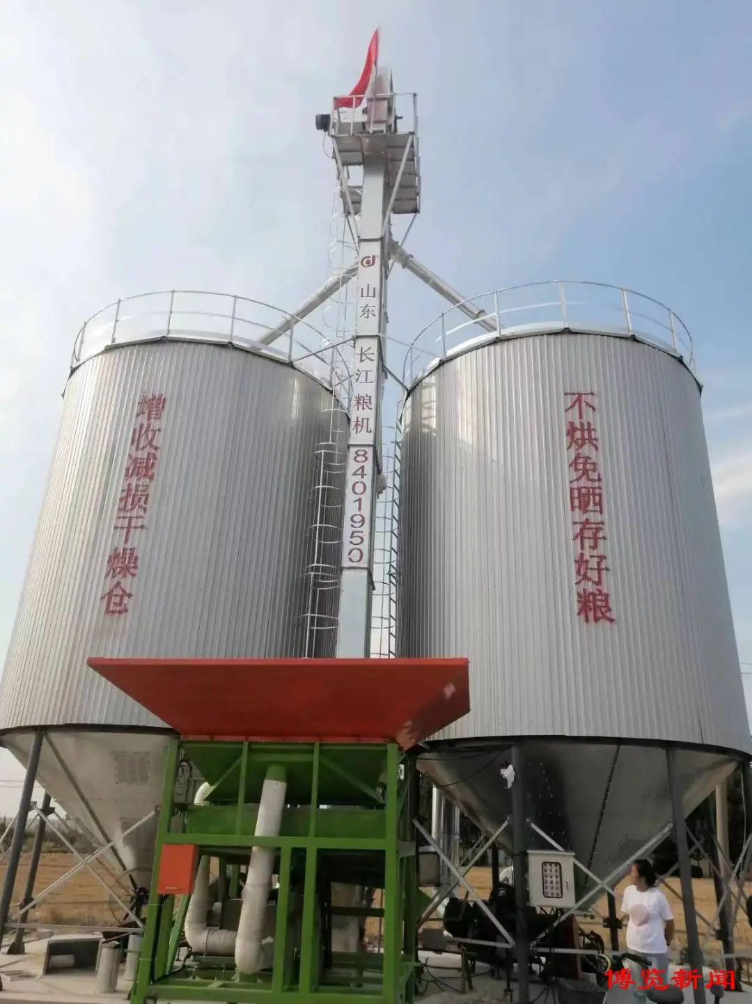 锥底型智慧小麦干燥储粮仓,单个客积128立方米,储存100吨小麦,占地6米x6米x12米,起到提前麦收、玉米早播、不用晒粮、无需烘干、储粮安全、售粮方便,每年可减损增收6万元左右。两个一组共用一个提升机,性价比更高。“在镇上和村里领导的大力支持下,低温通风智能干燥仓建设正在稳步推进,目前地基已经打好,设备已经提前预定,就等着安装了。”桓台县启润农业合作社孙城高兴地说,“我们考察了各种仓储设施,选择了欧洲优尼亚连续式烘干塔的分段筛选设备,配套淄博本地厂家山东长江粮油仓储机械有限公司生产的智慧储粮干燥仓,实现净粮入仓。”
