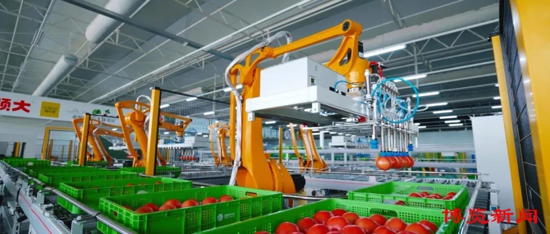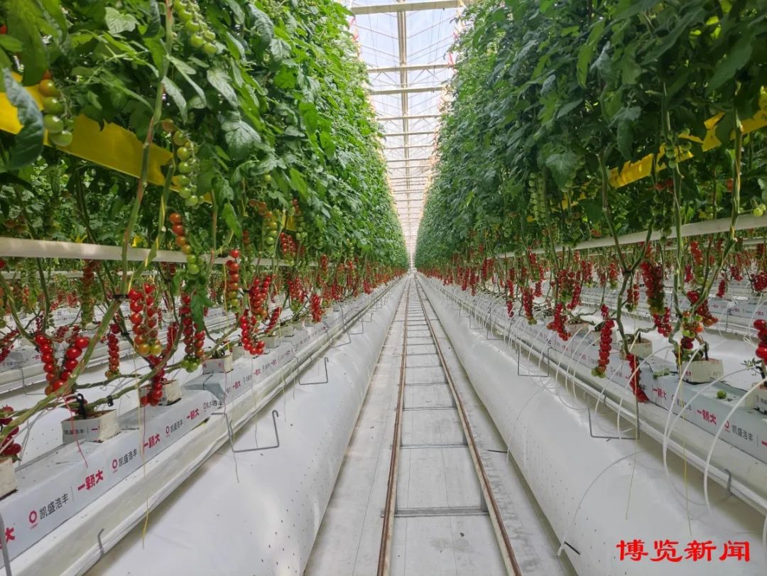 淄博数字农业示范区智能植物工厂由淄博市农发集团投资建设,共建设6座玻璃温室,引进青岛凯盛浩丰专业运营,发展高端番茄产业。园区采用全国领先的半封闭温室技术,大量运用数字技术,采用多层式、立体化无土栽培,光、温、水、气、肥实时监测、自动调节,实现全年、全天候生产,产量较传统温室提升300%。巨大的温室里,番茄藤蔓吊在半空中,绿色往远处伸展,蜜蜂在绿丛中飞舞,藤蔓下面一串串小番茄如绿的、红的珠宝,鲜亮诱人。设施农业包装自动化系统,由AGV地磁轨道导引自主物流系统、智能缓存、动态称重、机器人上料、全自动分选等系统组成,结合MES系统能够追踪从采收到加工全过程数据,是凯盛机器人根据番茄量身定做的首条全自动生产线。