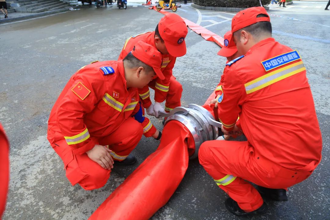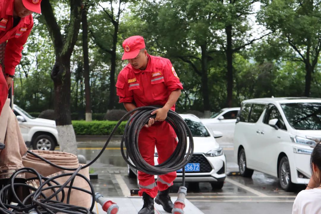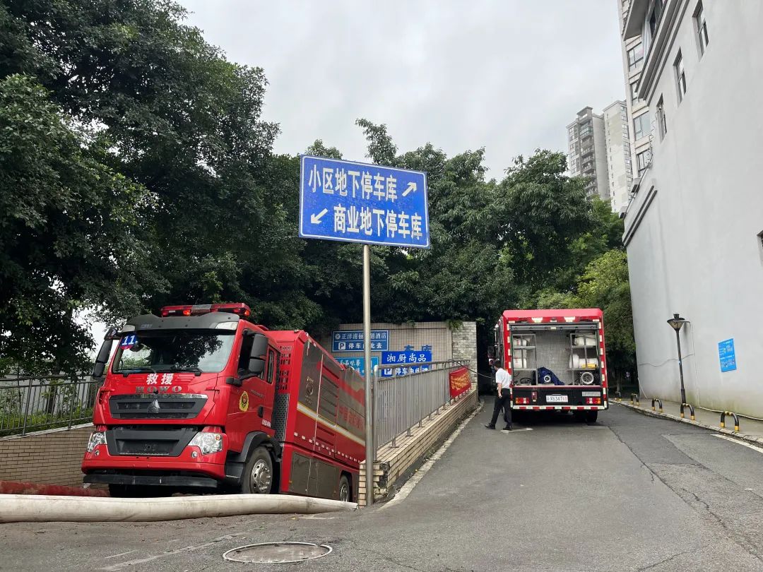 任务区位于巴南区巴滨路与龙洲大道交界处约300米处,根据现场情况,该区域由于地势低洼,周边雨水顺势汇聚,将小区地库淹没。处置期间救援队员们克服老旧小区操作空间受限等因素,通过联合其他救援力量,采取“垂直架设、缩短距离”“双向并进、同时抽排”的战术开始抽排水作业,经过4小时奋战,累计排水7600方,圆满完成抽排水任务。
