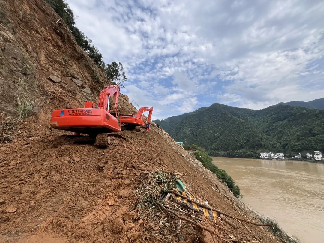6月20日,受强降雨影响,安徽省黄山市歙县多处发生洪涝灾害。接安徽应急管理厅电话请求,中国安能一局合肥救援基地投入60人、44台装备,主要担负小川乡、绍濂乡受损道路抢通任务。