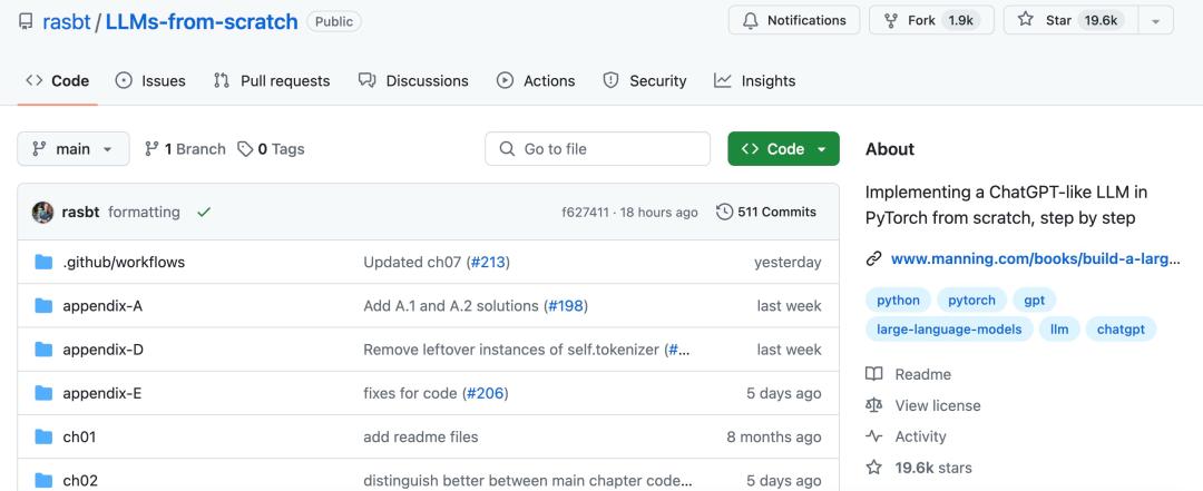 最近,Sebastian Raschka 在 GitHub 上开源了这本新书对应的代码库。