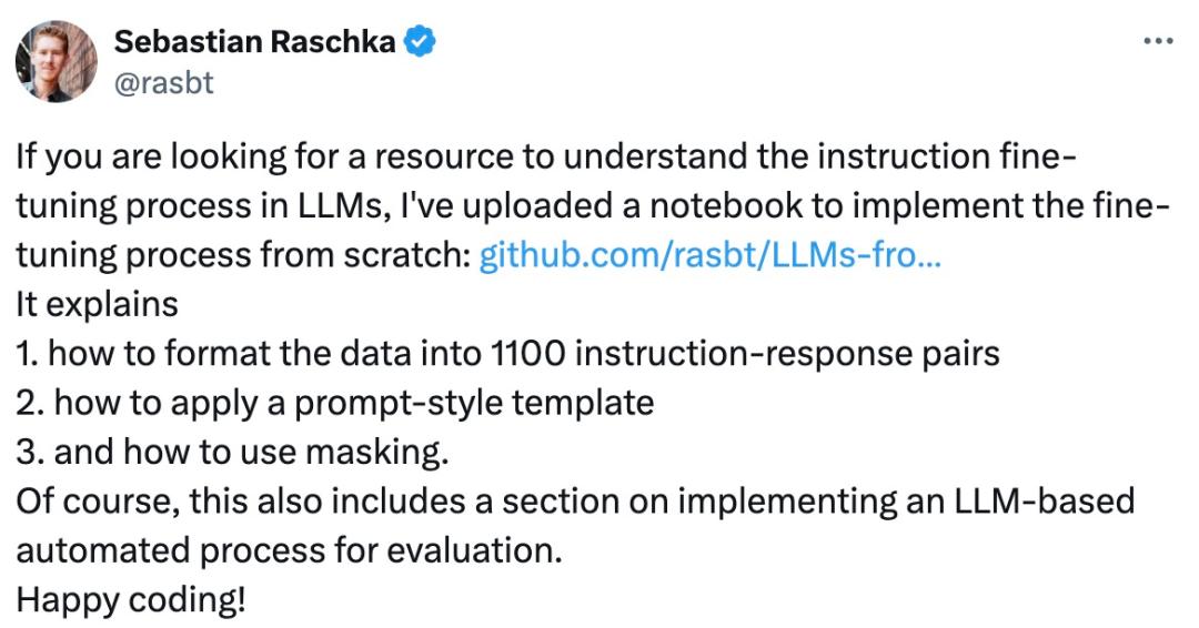 对 LLM 来说,指令微调能够有效提升模型性能,因此各种指令微调方法陆续被提出。Sebastian Raschka 发推重点介绍了项目中关于指令微调的部分,其中讲解了: