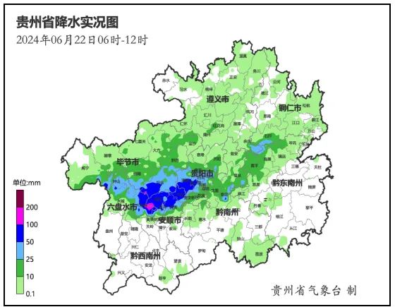 记者6月22日从贵州省气象局获悉,6月22日06时至12时,大暴雨出现在六盘水市的六枝、安顺市的普定、毕节市的织金3县(区),雨量最大为六枝特区城关132.3毫米。暴雨出现在六盘水市的六枝、水城、钟山,安顺市的平坝、普定、西秀、镇宁,毕节市的威宁、纳雍、织金、黔西,贵阳市的云岩、清镇、观山湖、白云,黔南州的贵定共16县(市、区)域内的110个观测站,大雨有259个观测站,中雨有425个观测站,大雨以上降雨主要在贵阳市西南部、安顺市北部、毕节市南部、六盘水市北部、铜仁市西南部;24个县(市、区)出现256站次短时强降水,小时雨强最大为织金县阿弓尚寨71.8 毫米(22日06时至07时)。