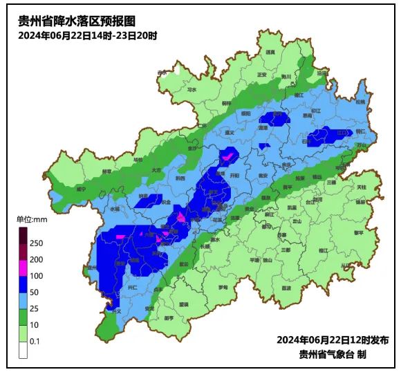 根据最新气象资料分析,预计今天下午到明天白天,省的西部及中北部地区阴天有阵雨或雷雨,遵义市南部、铜仁市南部、毕节市南部及东部、贵阳市中西部、安顺市北部、六盘水市、黔西南州北部及西部有大雨到暴雨,部分乡镇有大暴雨,个别乡镇有特大暴雨,最大雨量220mm-250mm,其余地区阴天间多云有阵雨或雷雨。