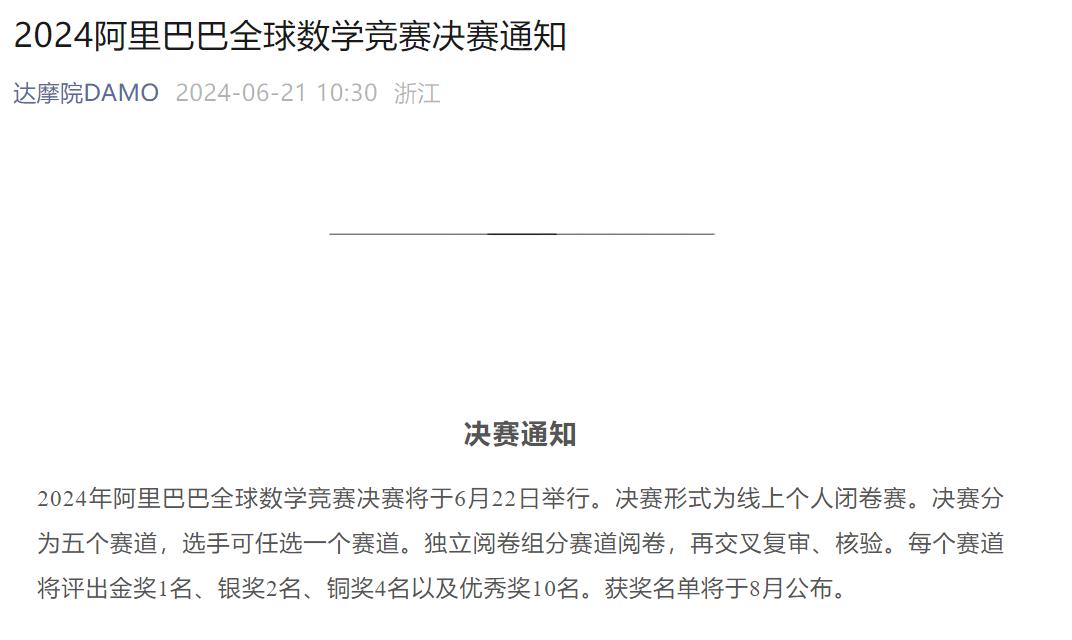 6月21日,阿里达摩院发布2024阿里巴巴全球数学竞赛决赛通知,称决赛时间为6月22日(周六)0:00-24:00,参赛选手可以选择比赛窗口期内任意连续的8小时作答。形式为线上个人闭卷赛。