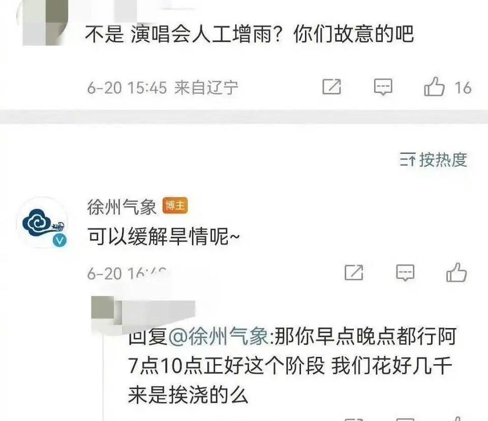 由于6月21日至23日薛之谦在徐州奥体中心有三场演唱会,很多粉丝对21日当晚的降雨表示不满,甚至在徐州气象微博下开怼,指责气象部门故意为之,并质疑为什么不能开完演唱会再增雨等。