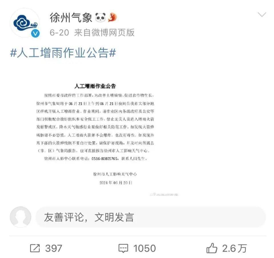网友评论截图根据徐州市人工影响天气中心6月20日发布的人工增雨作业公告,为改善土壤墒情、促进农作物生长,徐州市气象局于6月21日上午到夜间在徐州大部分地区择机开展人工增雨作业。