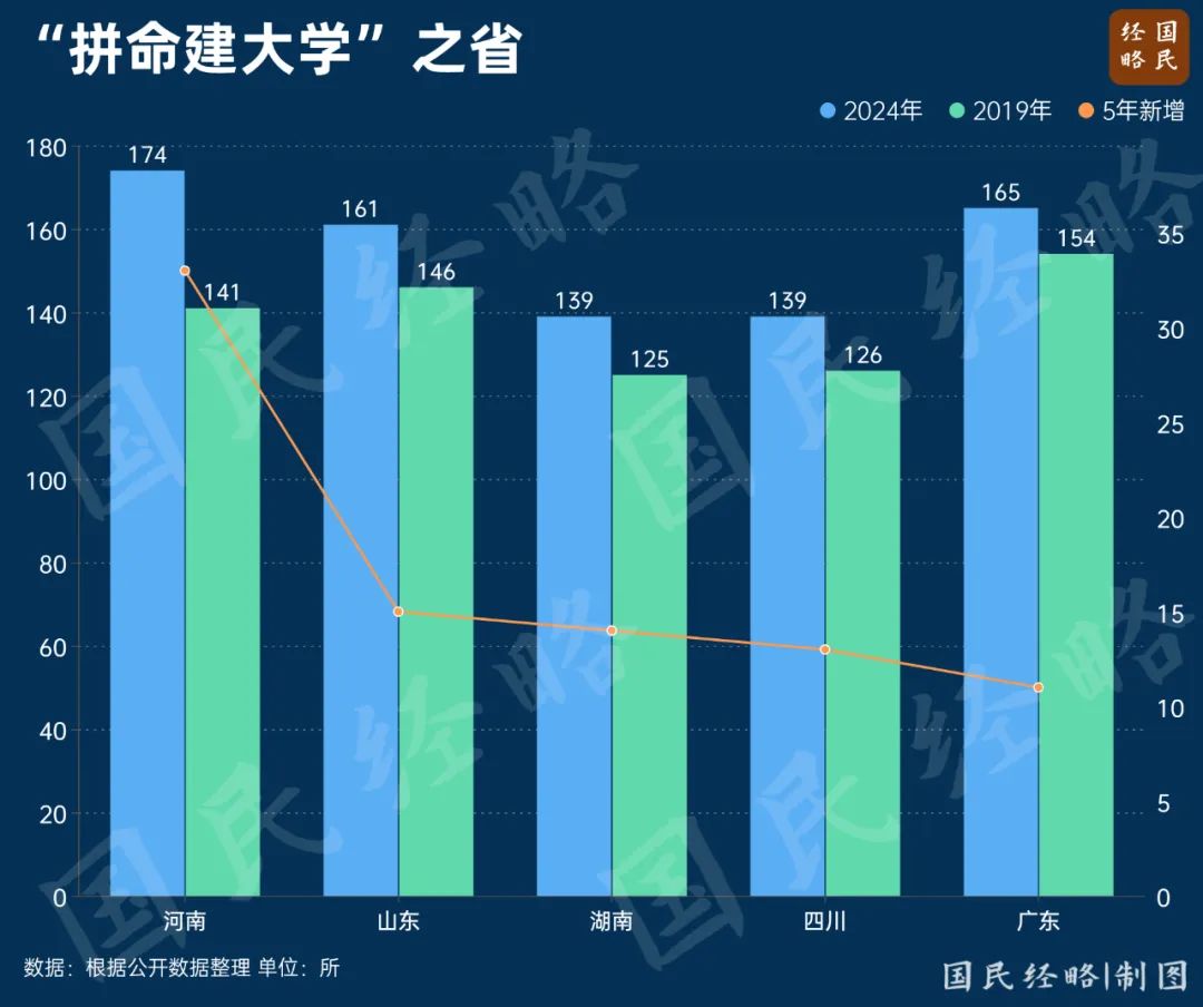 功夫不负有心人。短短几年过去,河南高校数量从141所大幅增加到174所,新增高校数量占到全国的1/5左右,堪称“拼命建大学”的最大赢家。