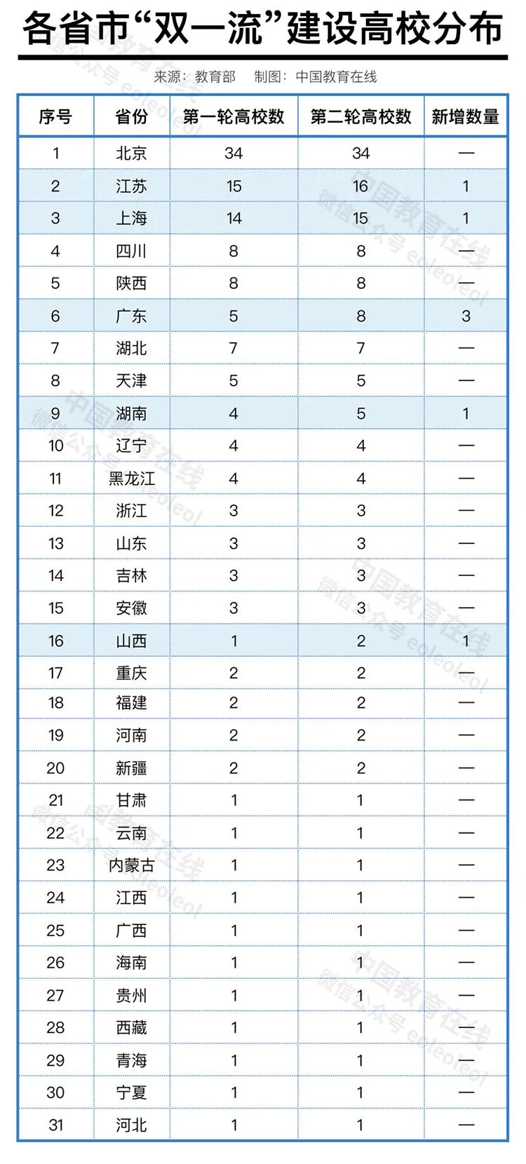 根据最新双一流大学名单,内地共有147所高校入围,其中最高的北京拿下34所,而河南仅有郑州大学、河南大学2所高校入围。