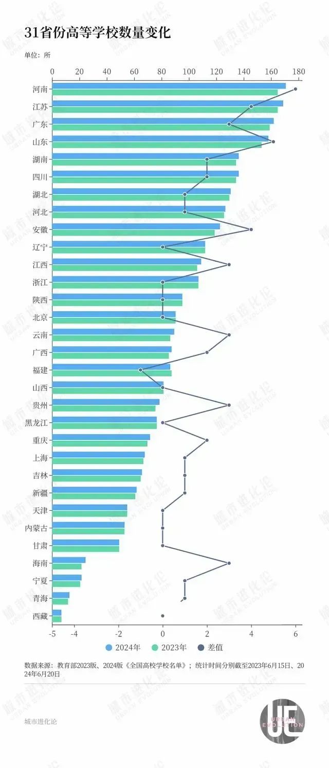 这地晋级全国“高校数量第一省”分省份来看,本轮“年增48所普通高校”的主力是河南(6所)、山东(5所)、江苏和安徽(各4所),此外广东、江西、云南和海南也都新增了3所普通高校,与此同时,福建的高校数量则减少了1所(福建对外经济贸易职业技术学院被撤销办学)。