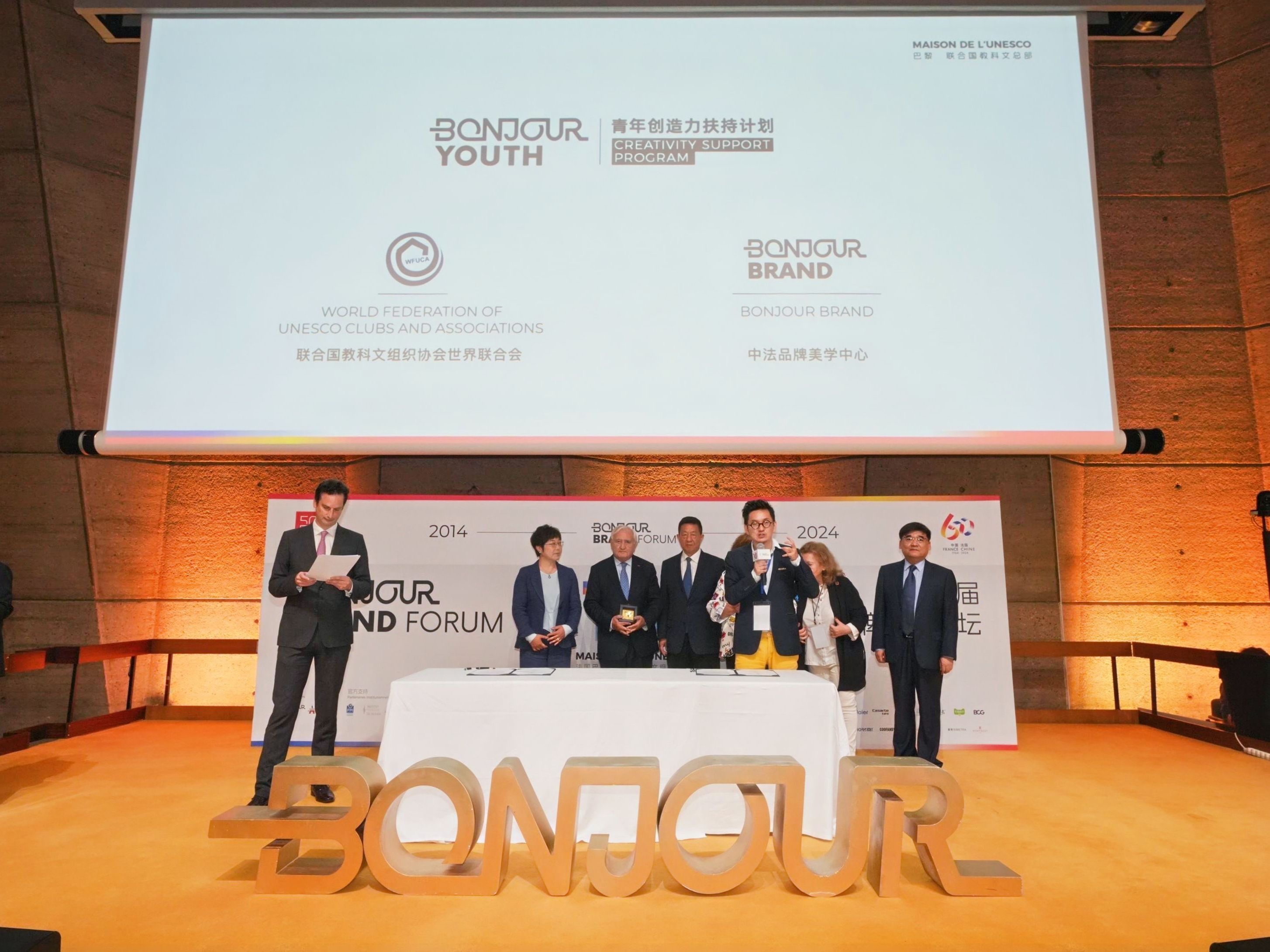 在随后的环节中,联合国教科文组织世界联合会(WFUCA)与中法品牌高峰论坛组委会宣布共同发起《Bonjour Youth》全球青年创造力扶持计划。该计划旨在搭建具有全球影响力的扶持平台,通过与全球城市及品牌的合作,为青年提供设计、创意、科技与艺术方面的机会,激发并培养其创新能力,用创造力搭建不同国家之间的文化对话,最终促进全球设计创意行业的合作与发展。百雀羚作为加入该计划的首个品牌,与发起方在现场进行了签约仪式。