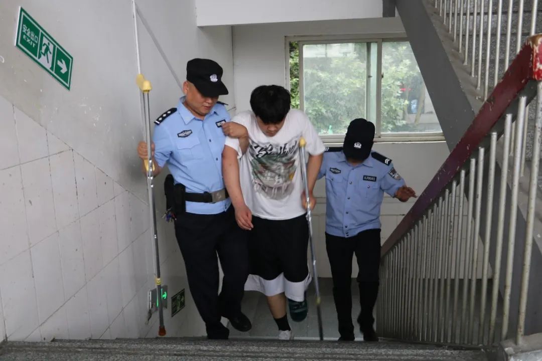 ▲南阳市宛城区四中考点,新华派出所执勤民警搀扶脚踝受伤的考生上楼。